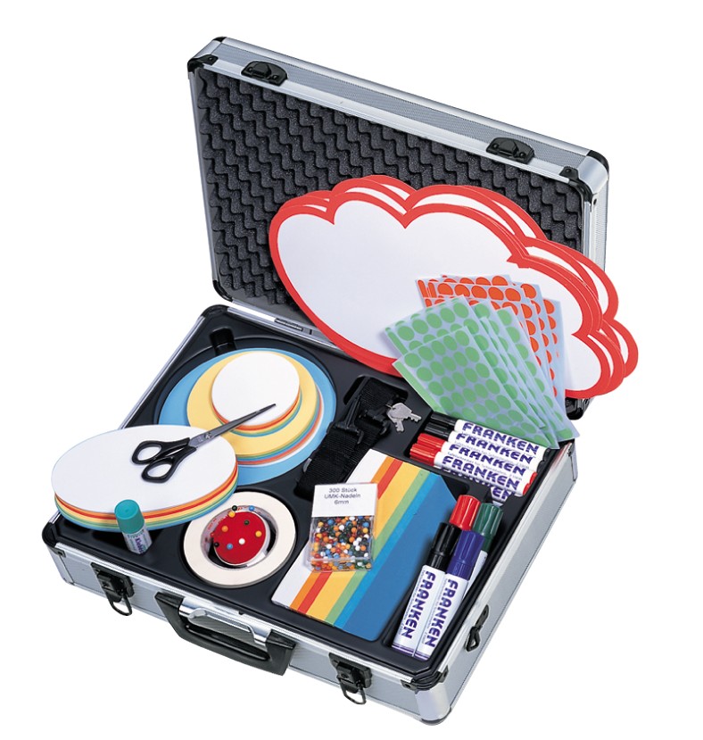 Sadrzi:5 oblacica 25x42cm, 500 pravougaonika 9,5×20,5cm, 100 ovala 11x19cm, 100 krugova fi 9,5cm, 100 krugova fi 14cm, 50 krugova fi 19,5cm, oko 500 krugova za markiranje, 16 board markera, 4 dzambo markera, makaze, krep traka, lepak u stiku, spenadle za markiranje, laserski pokazivac sa hemijskom olovkom