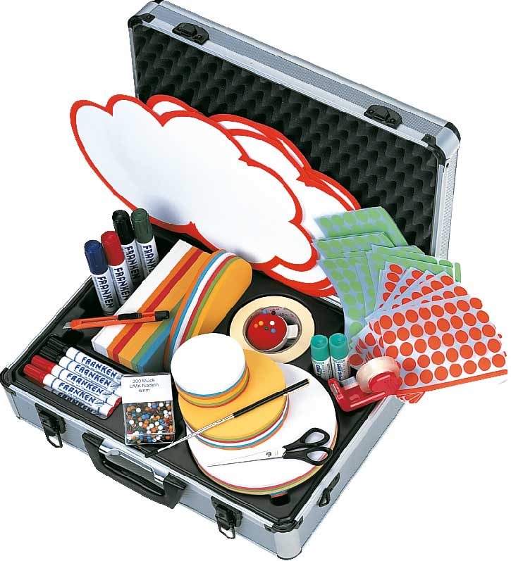 Sadrzi:5 oblacica 25x42cm, 500 pravougaonika 9,5×20,5cm, 200 ovala 11x19cm, 200 krugova fi 9,5cm, 50 krugova fi 14cm, 150 krugova fi 19,5cm, oko 500 krugova za markiranje, 10 board markera, 4 dzambo markera, makaze, krep traka, lepak u stiku, spenadle za markiranje, laserski pokazivac sa hemijskom olovkom.