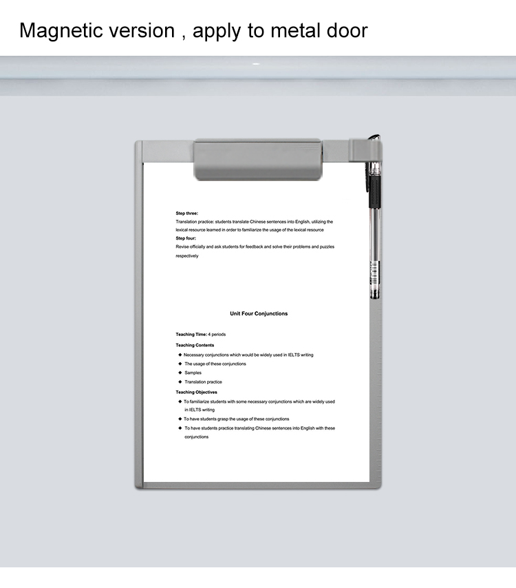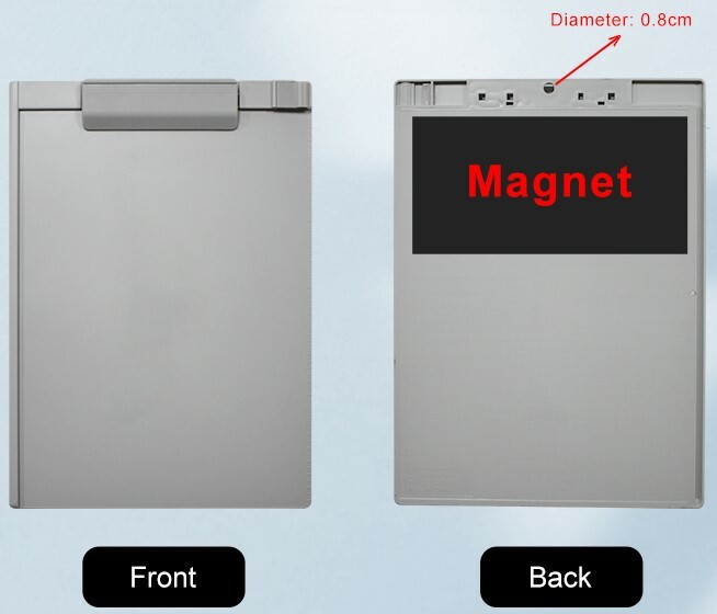 Napravljena od tvrde plastike sa magnetnom površinom sa zadnje strane tako da je moguće postaviti stabilno na bilo koju metalnu površinu. Sa prednje strane se nalazi klipsa koja drži papir i mesto za odlaganje olovke.