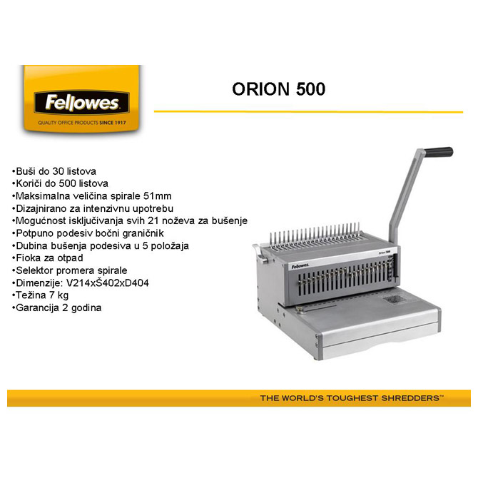 za format A4; za profesionalnu upotrebu; buši do 30 listova 80 gramskog papira; mogućnost isključivanja svih 21 noževa; maksimalna veličina spirale do 50 mm; kapacitet: 500 listova; ručna; povezuje samo u plastičnu spiralu; podesivi graničnik za precizno poravnanje listova, odvojene ručke za bušenje i povezivanje i selektor promera spirala prema debljini dokumenta; metalni mehanizam za duži vek trajanja; dimenzija: 402x214x404mm; garancija na mašinu 2 godine