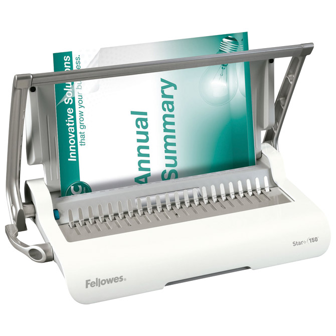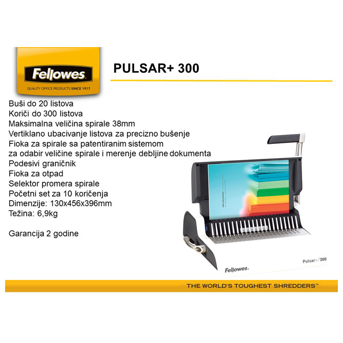 za format A4; buši do 15 listova 80 gramskog papira; maksimalna veličina spirale do 19 mm; kapacitet: 150 listova; ručna; povezuje samo u plastičnu spiralu; sadrži: fioku za odlaganje spirala, podesivi graničnik za precizno poravnanje listova, fioku za otpad, selektor promera spirala prema debljini dokumenta i odvojene ručke za bušenje i povezivanje; dimenzija: 448x280x80 mm; težina: 4,3 kg; garancija na mašinu 2 godine