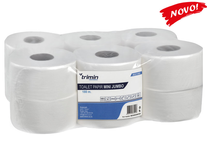 Mini jumbo toalet papir, 100% celuloza, 2sl., 115m. Visina 9,3cm, prečnik 19cm,perforacija 22cm, hilzna 64mm, pakovanje 12/1