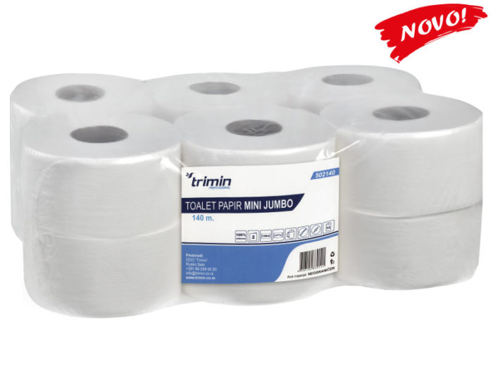 Mini jumbo toalet papir, 100% celuloza, 2sl., 140m. Visina 9,3cm, prečnik 19cm,perforacija 22cm, hilzna 64mm, pakovanje 12/1