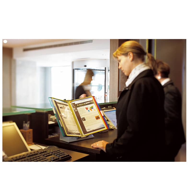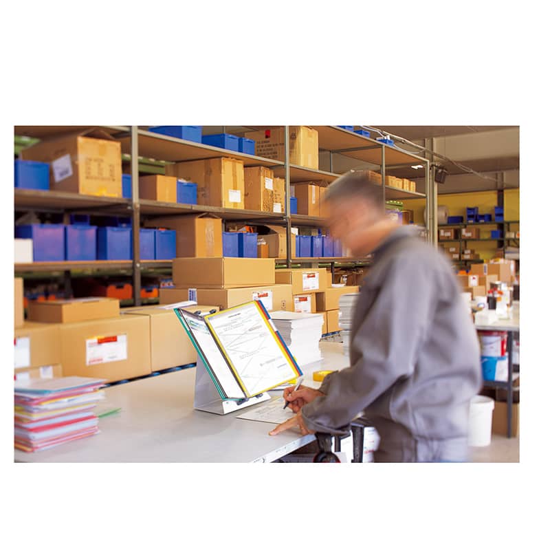 U paketu dolazi sa 10 raznobojnih ramova A4 formata (A4 uspravno), uključujući po 5×2 ramova u bojama zelena, crvena, plava, crna i žuta, što omogućava lakšu kategorizaciju i preglednost dokumenata. Nosač se nema potrebe za montiranjem, sa obzirom da je namenjen za korišćenje na stolu, sa svojim postoljem.